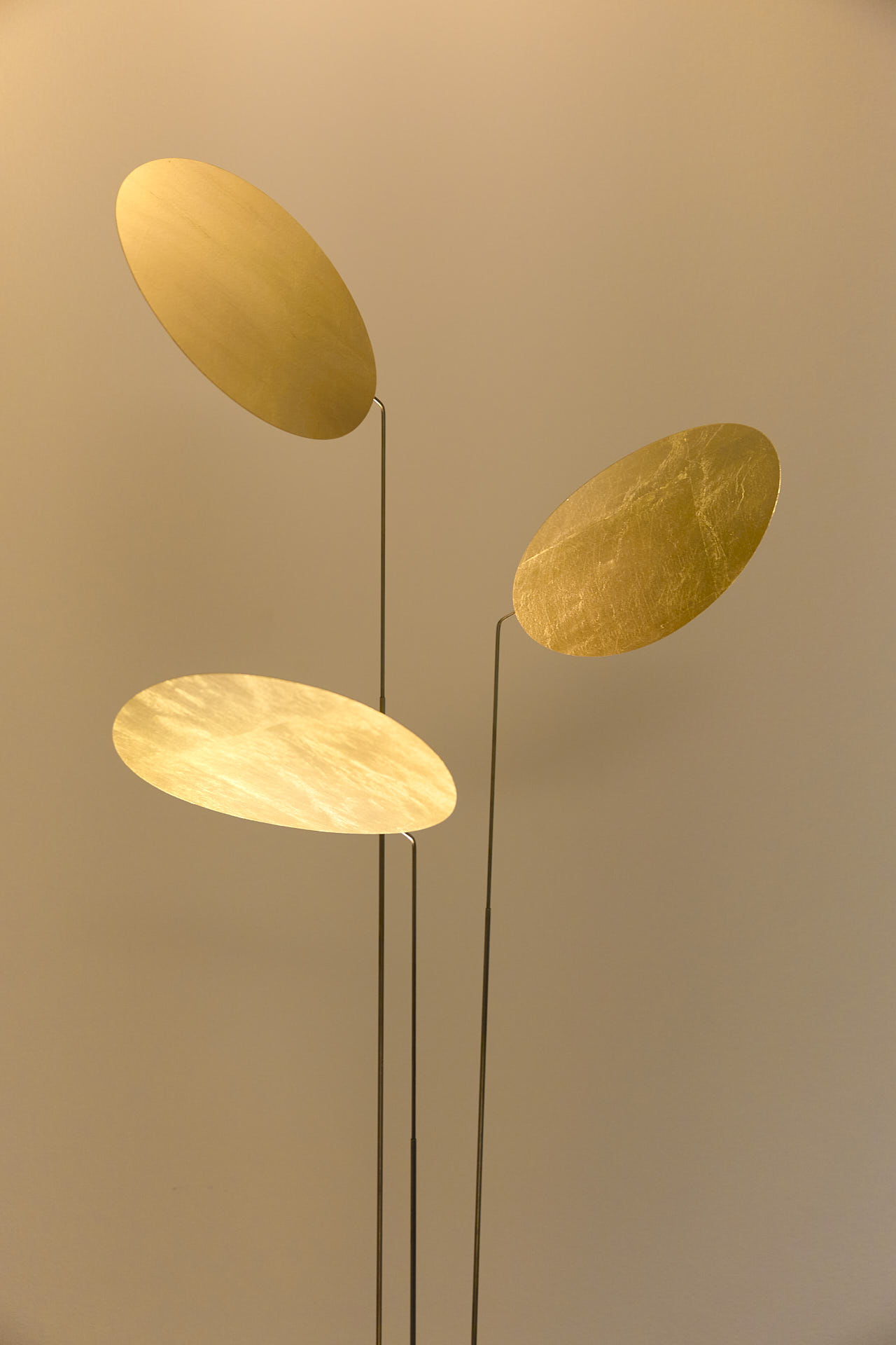 drei Goldpapieren, die zart an Edelstahlstäben befestigt sind und fast zwei