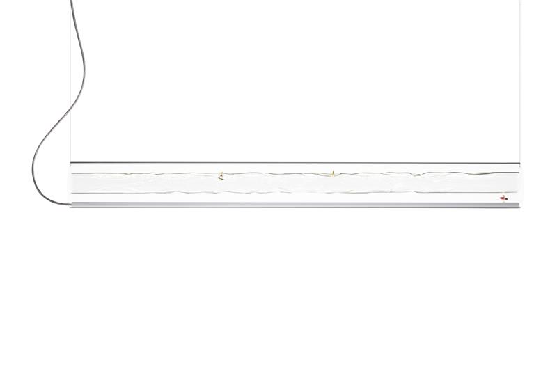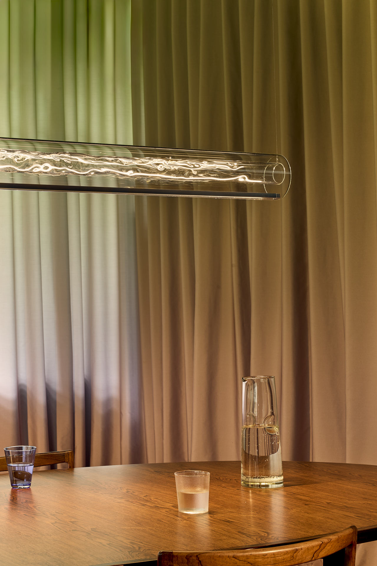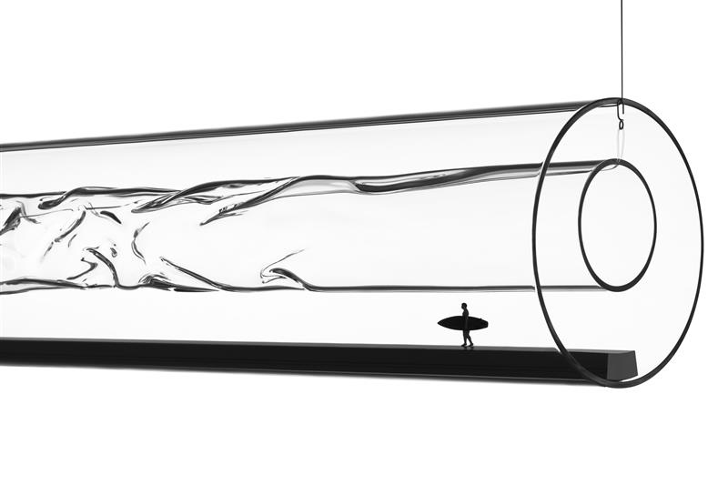 À l’intérieur se cachent deux sources lumineuses : l’une éclaire vers le haut, l’autre vers le bas, toutes deux à intensité variable. Il en résulte une combinaison de chaleur douce et atmosphérique et de clarté dirigée, réunies en un seul objet. Deux petites figurines de surfeurs peuvent suivre la forme ondulée du verre – leur présence est discrète, mais elle transforme l’ensemble.