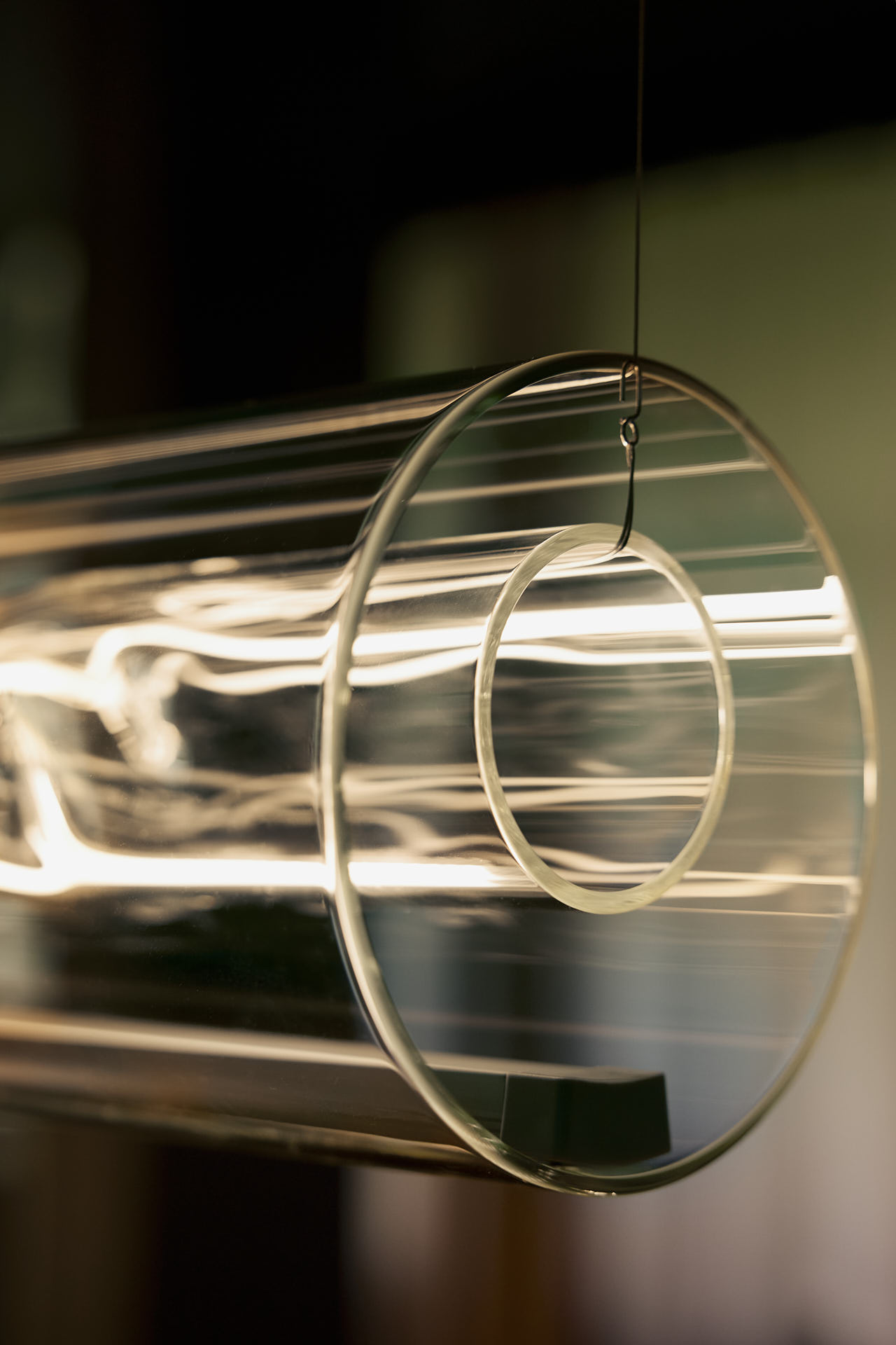 Un long tube en verre borosilicate, délicatement incurvé, semble flotter dans l’air – sa forme dessinée par la chaleur, la gravité et le rythme. Sa surface extérieure reflète et réfracte la lumière en lignes et motifs changeants.